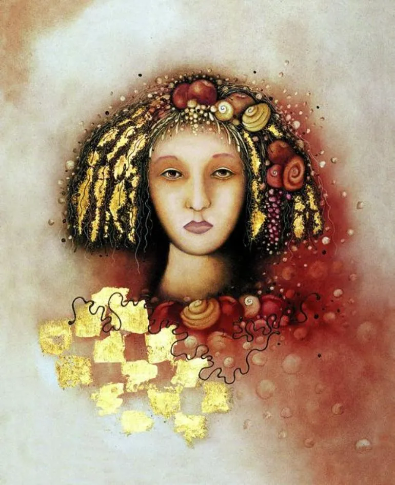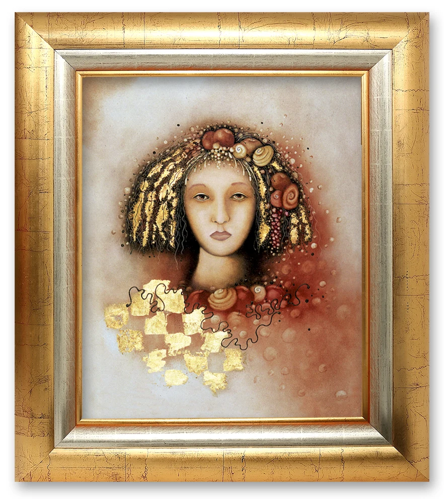 Slika je okvirjena z zlato-srebrnim okvirjem, pripravljena za obešanje.