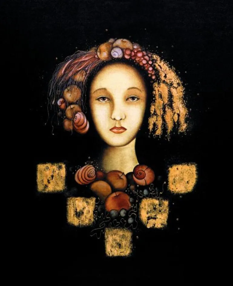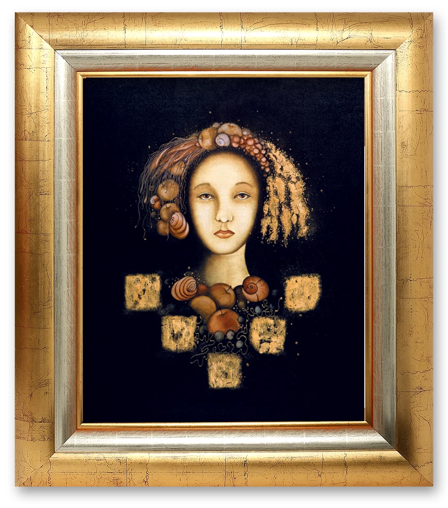 Slika je okvirjena z zlato-srebrnim okvirjem, pripravljena za obešanje.