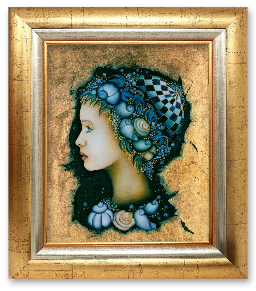 Slika je okvirjena z zlato-srebrnim okvirjem, pripravljena za obešanje.